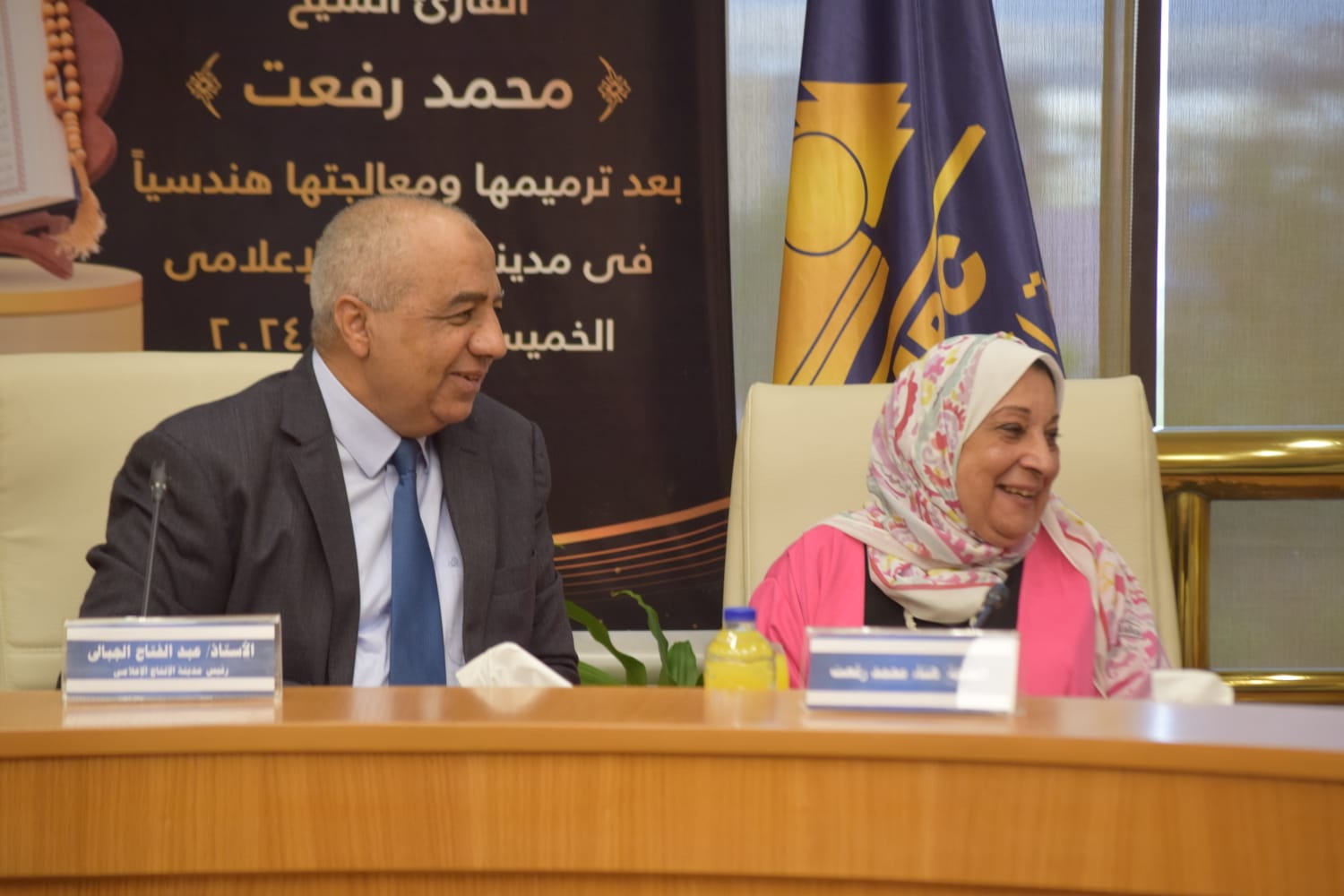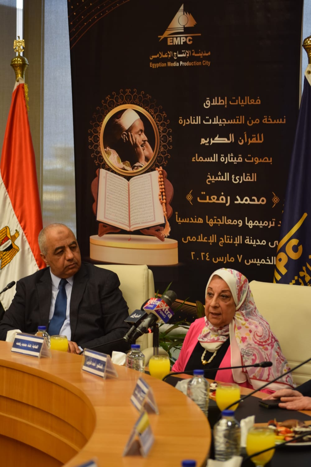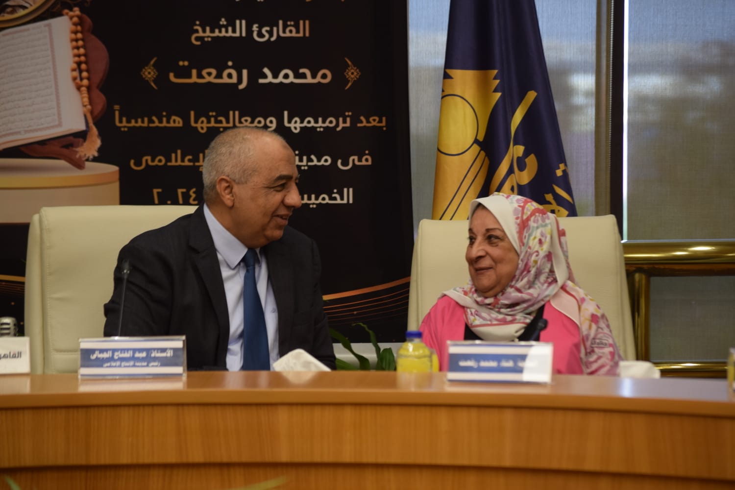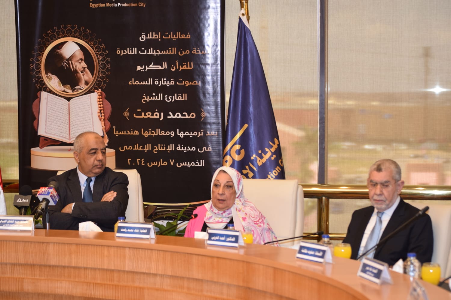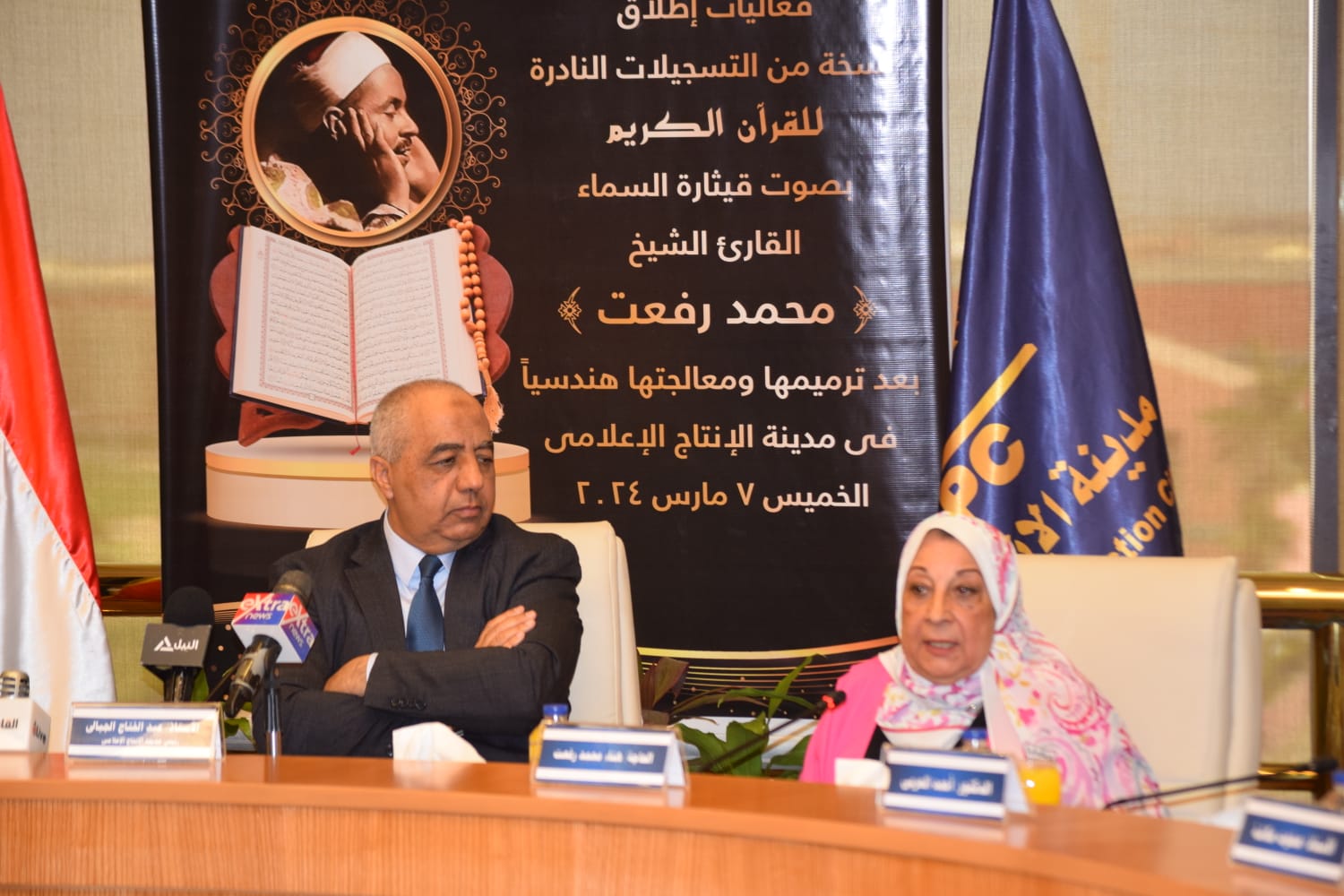 The Media Production City has completed the restoration work of a group of rare recordings of the Holy Qur’an with the voice of Sheikh Muhammad Rifaat and their engineering processing at the Center for the Revival of Audiovisual Heritage in the city. On this occasion, the city held a large celebration attended by Abdel Fattah Al-Gabali, Chairman of the Board of Directors and Managing Director, Muhammad Nawar, President of the Egyptian Radio, and Mrs. Hanaa Muhammad. Rifaat, the granddaughter of Sheikh Muhammad Rifaat, Ismail Dowidar, Vice President of the Holy Quran Network, and a number of media representatives and satellite channels.
